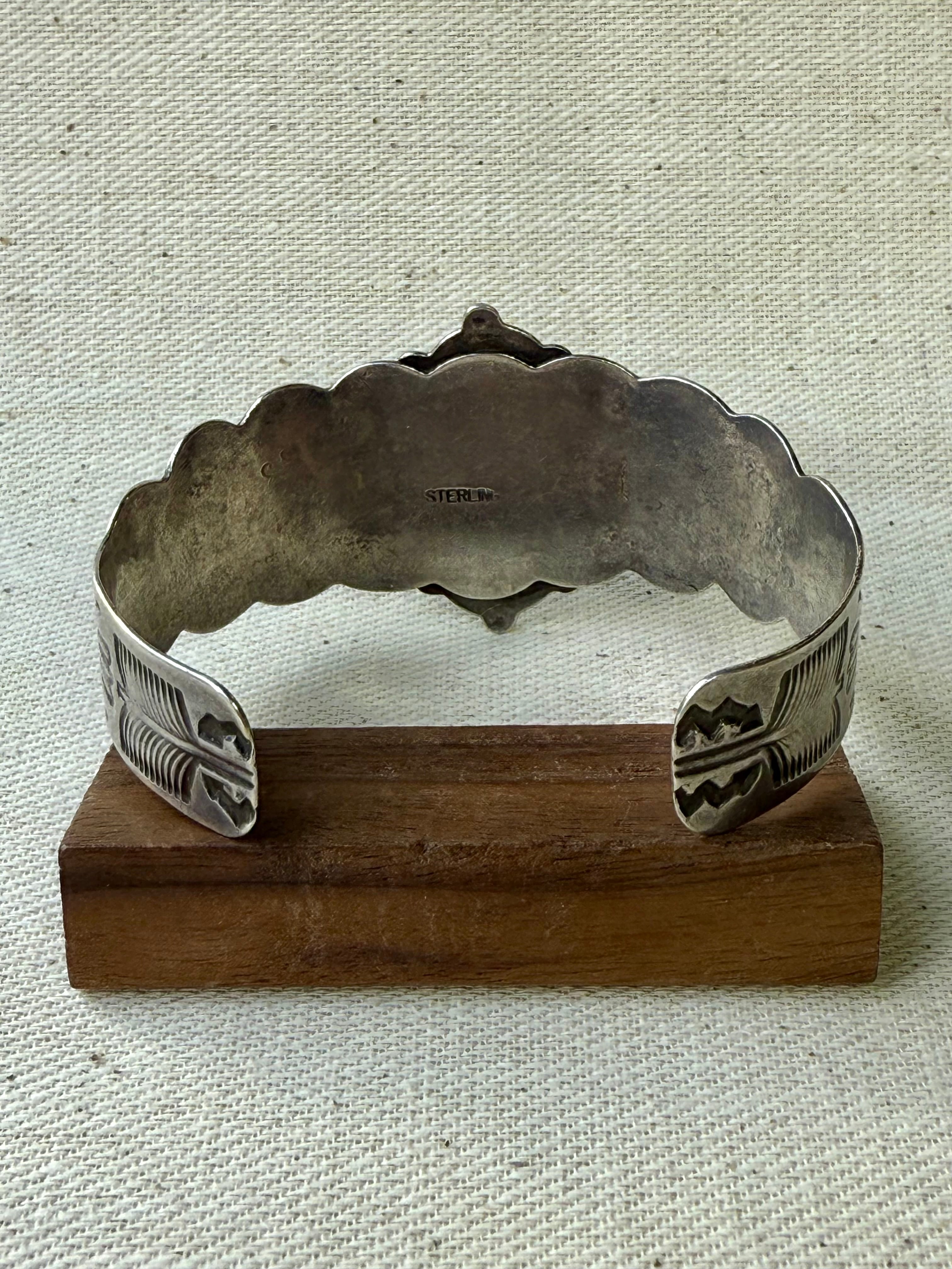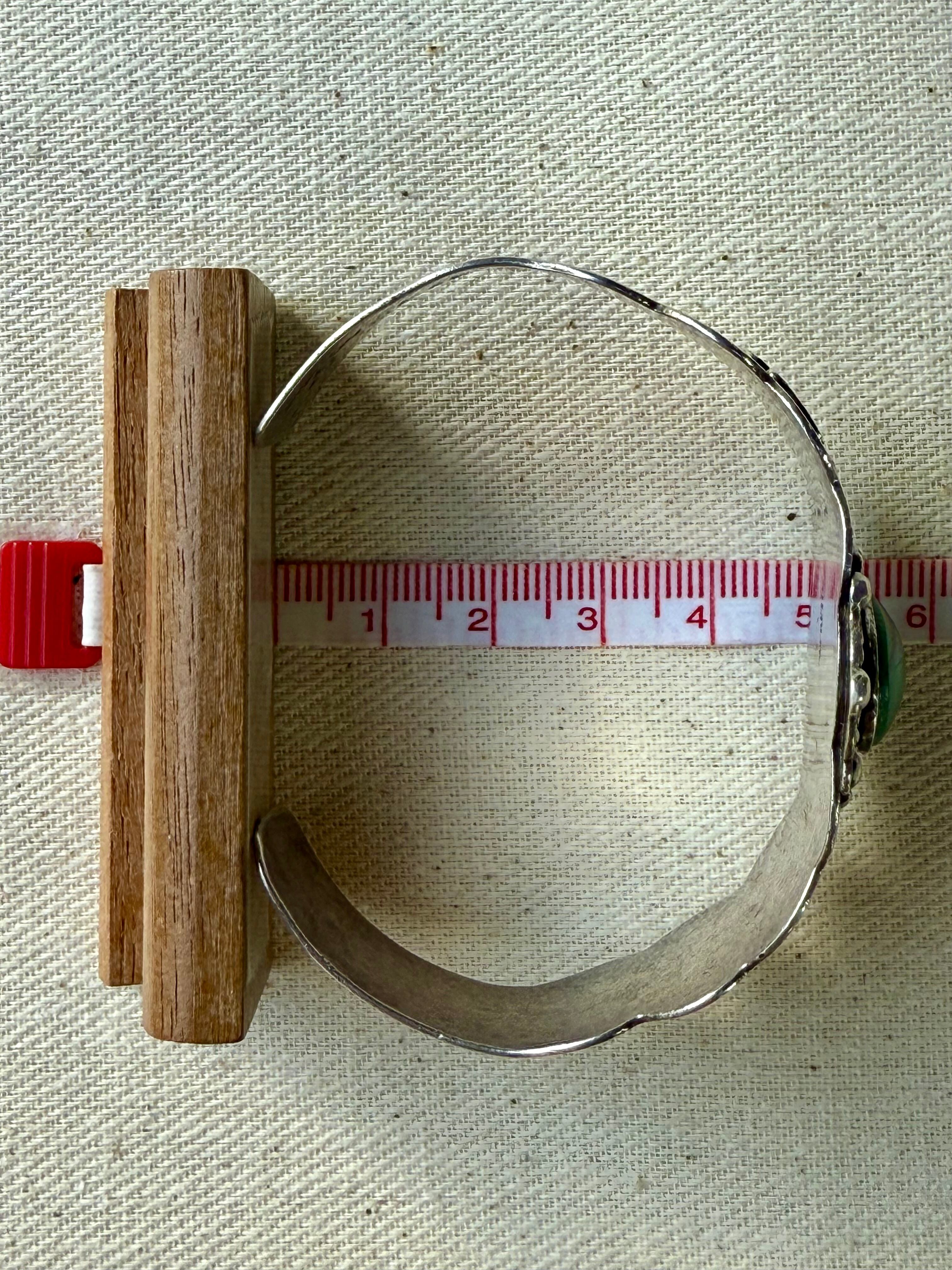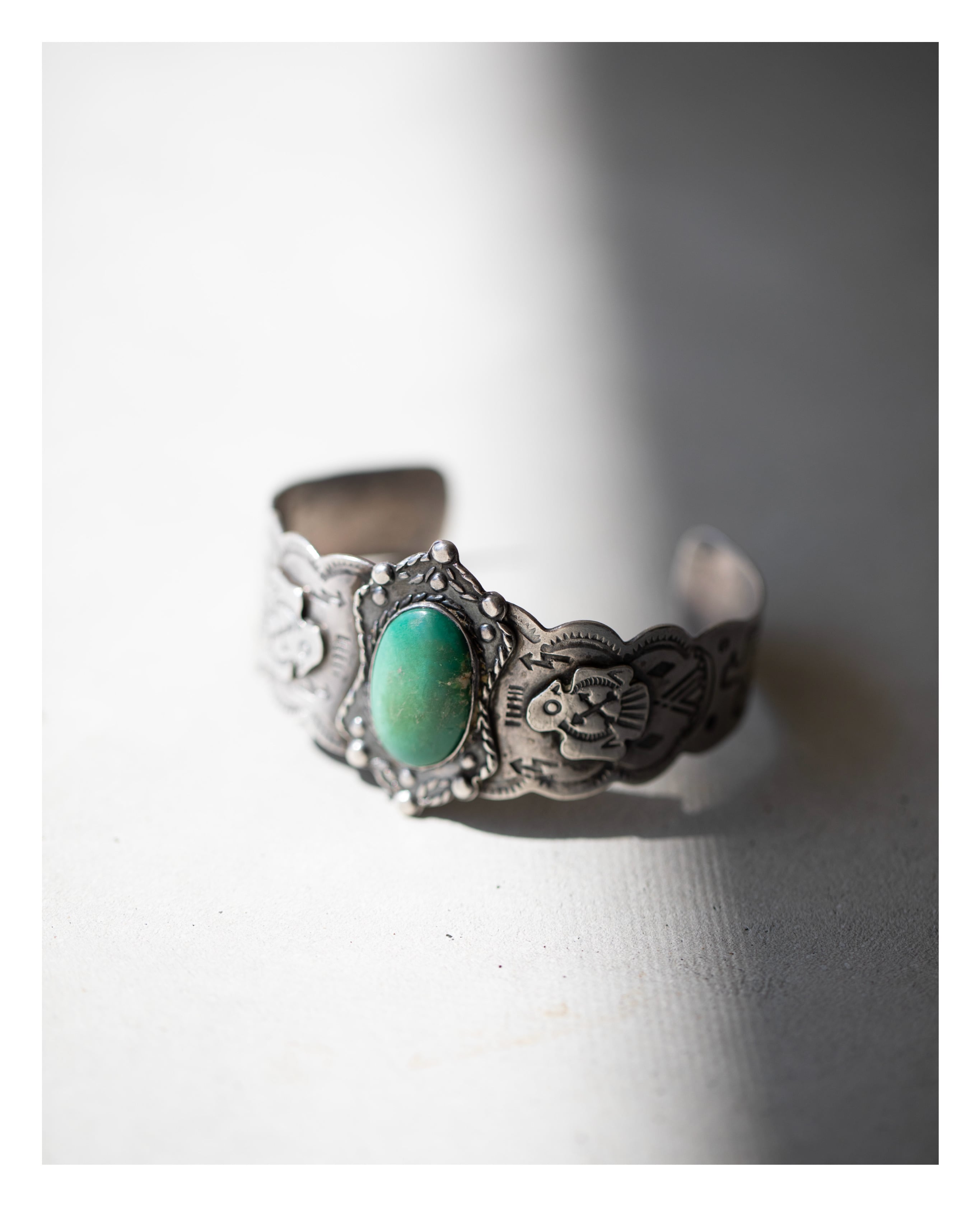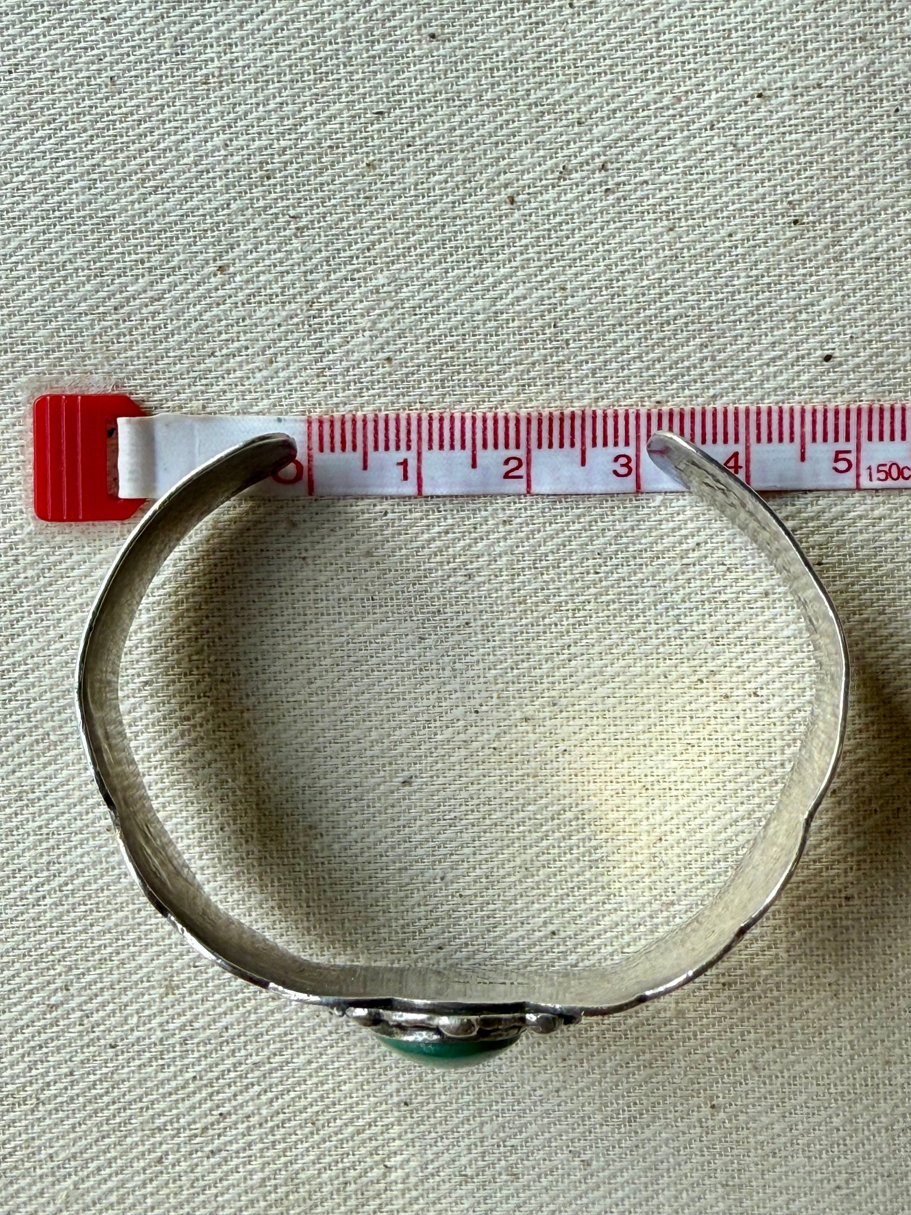 中央にグリーンターコイズを配し、周囲にドロップ装飾を巡らせた、存在感あるヴィンテージシルバーカフ。