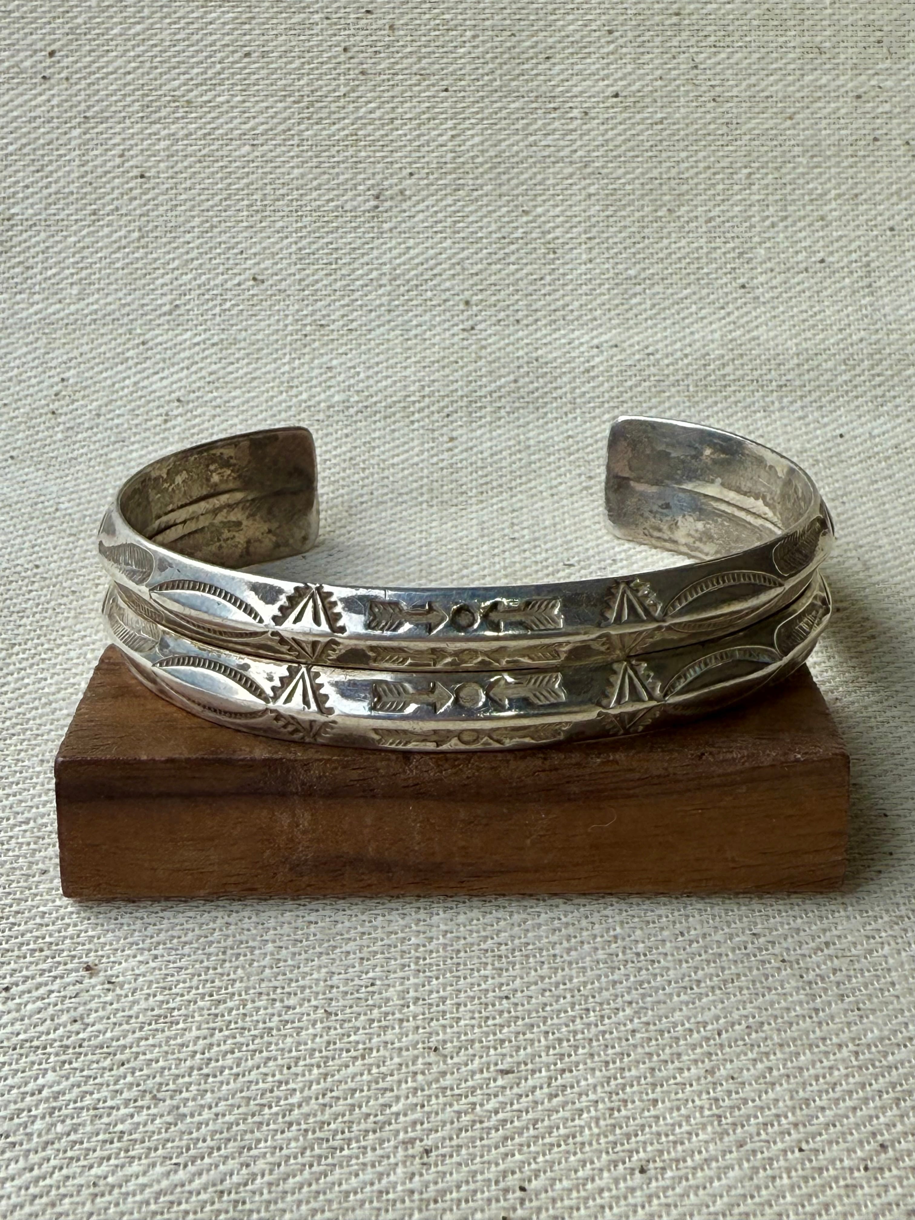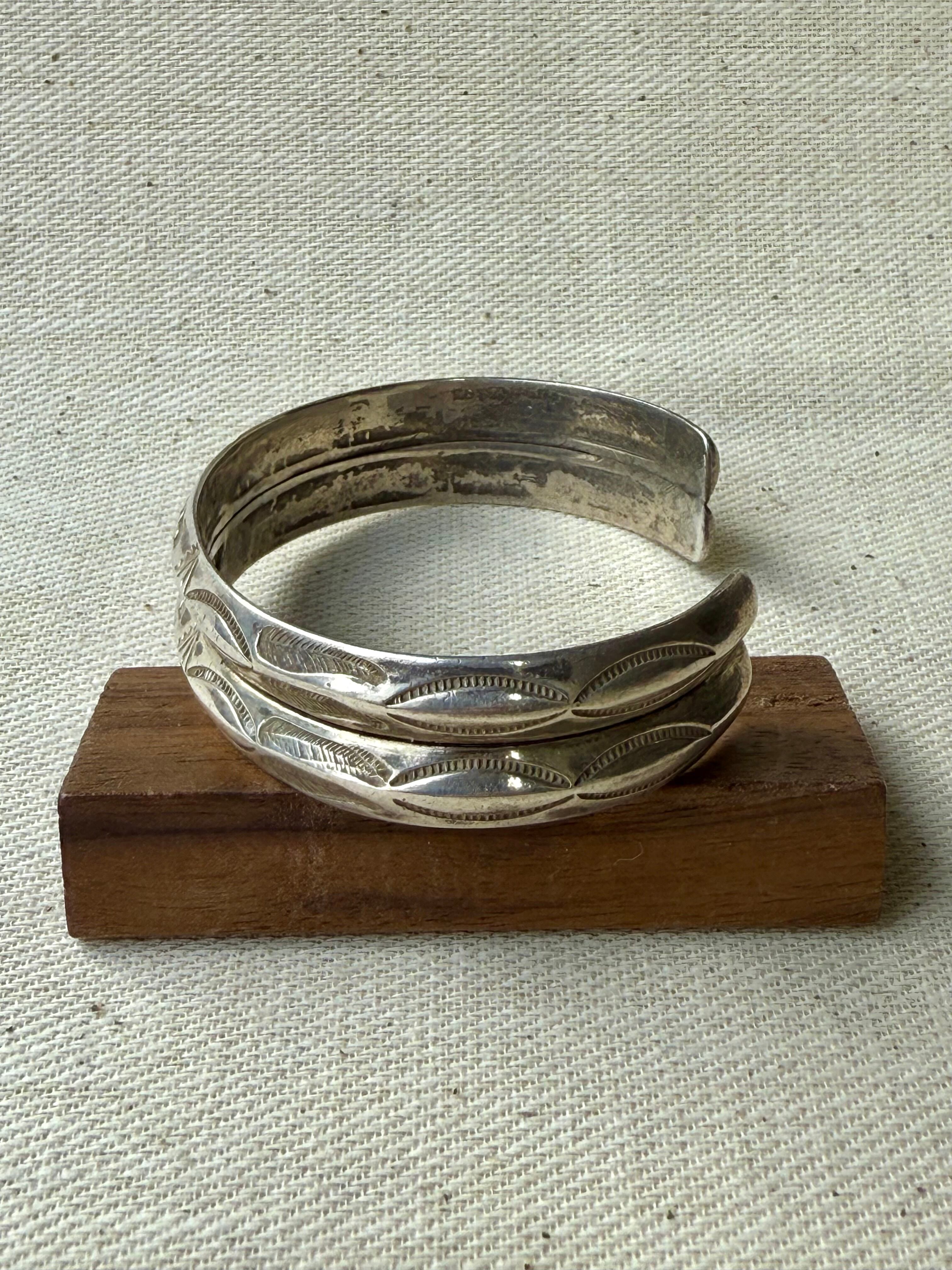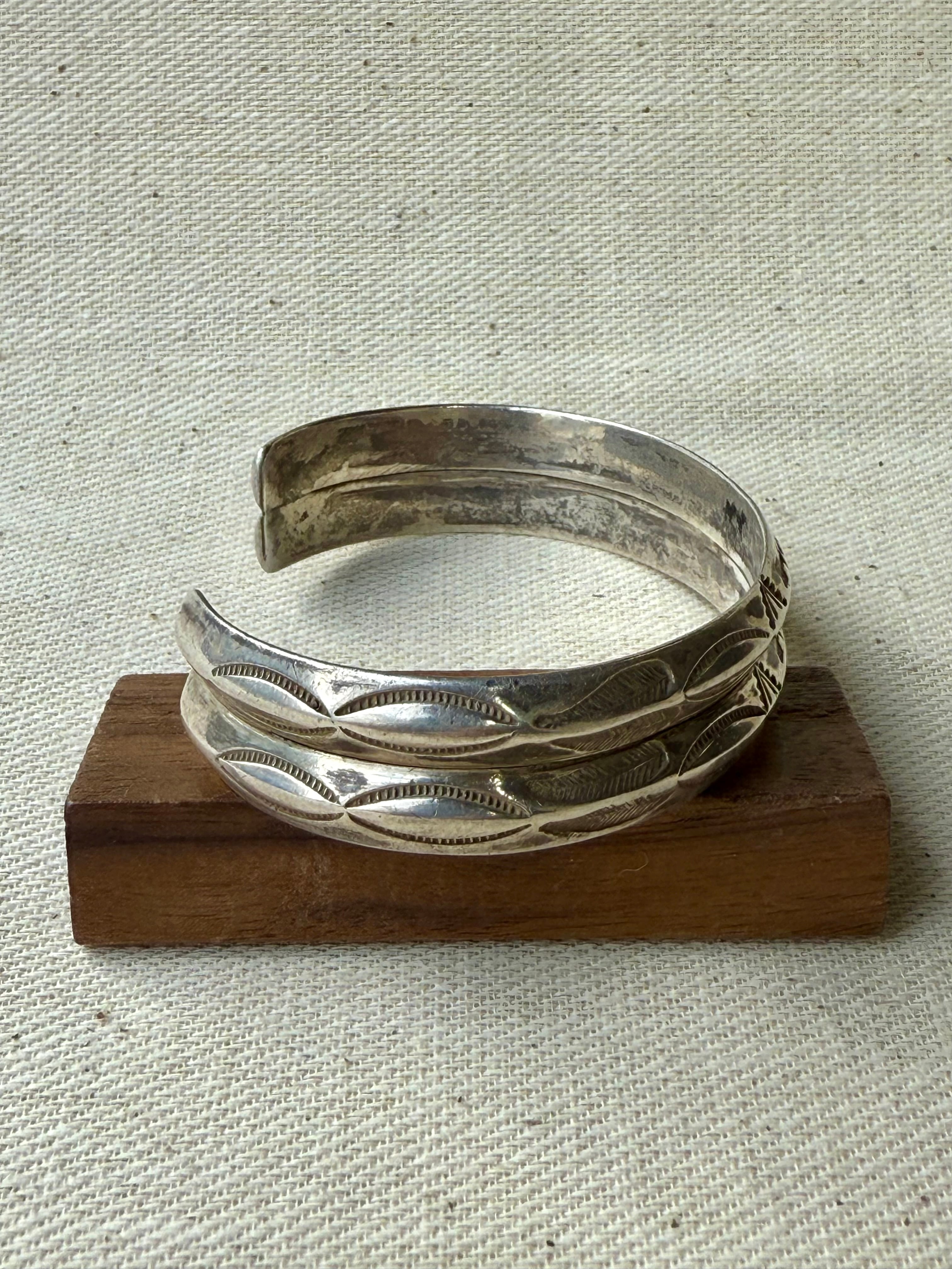 薄く延ばしたシルバーを丁寧に成形し、両端まで均質に刻まれた手打ちのスタンプワークが、当時のクラフツマンシップをそのまま伝えてくれます。