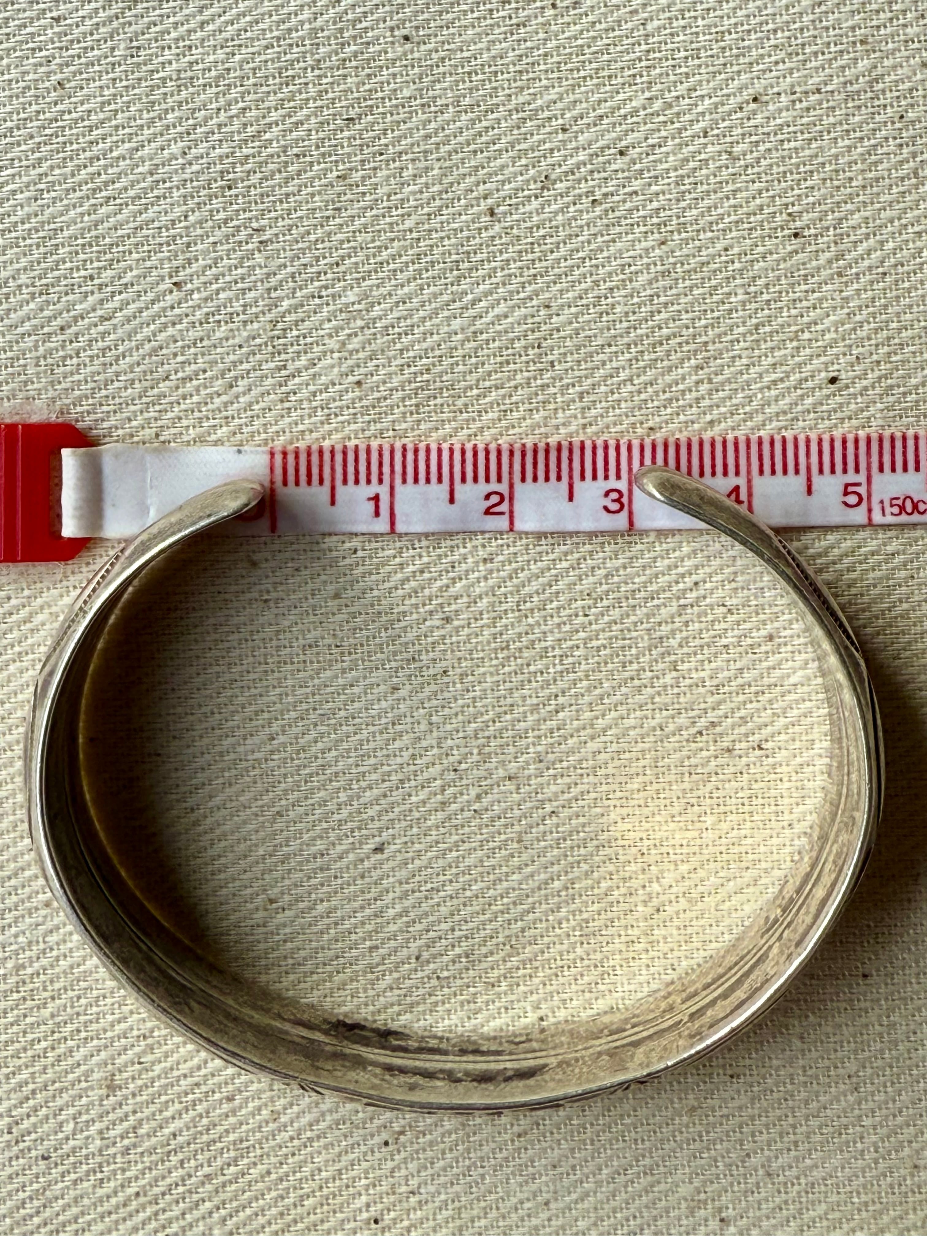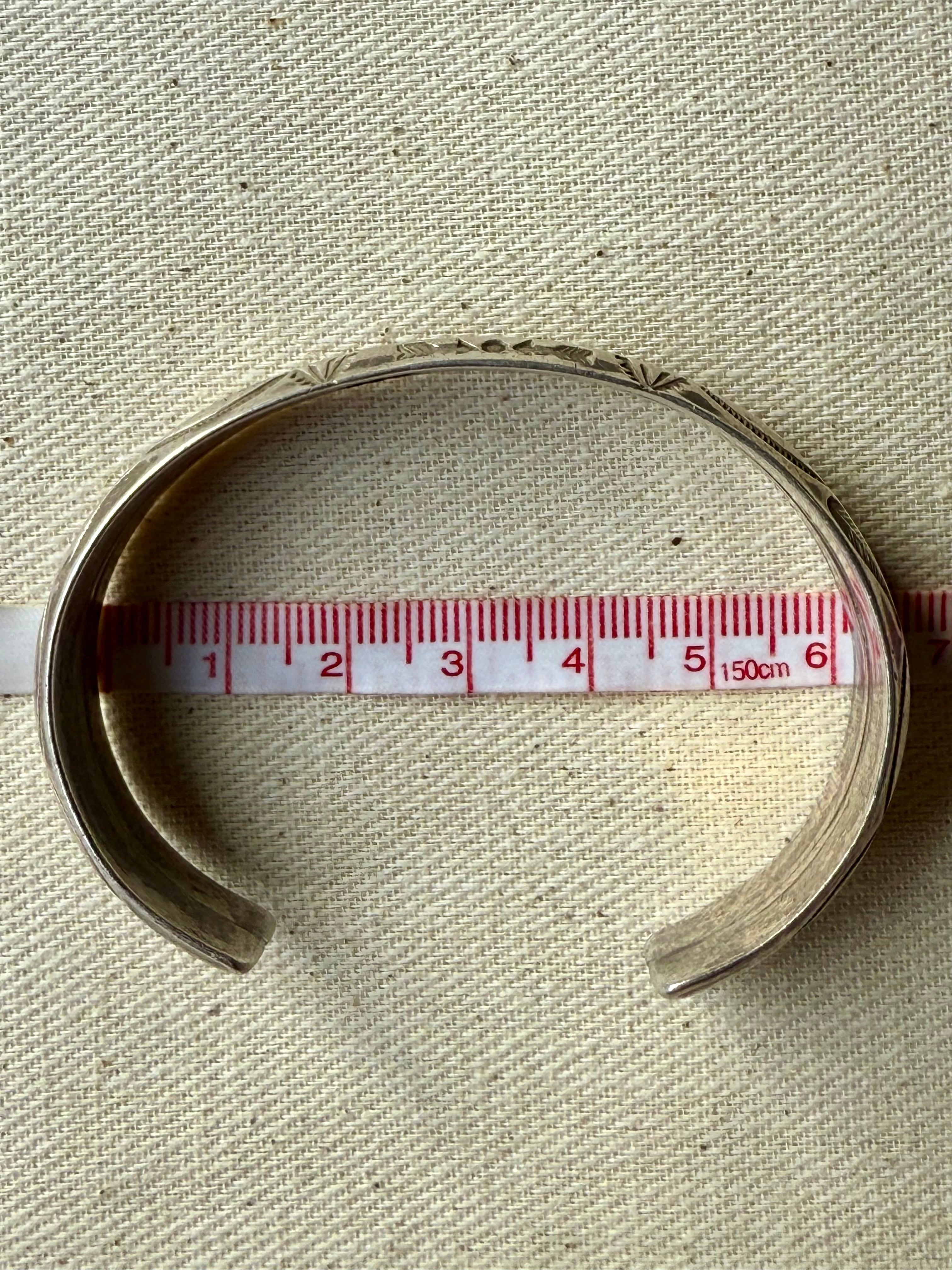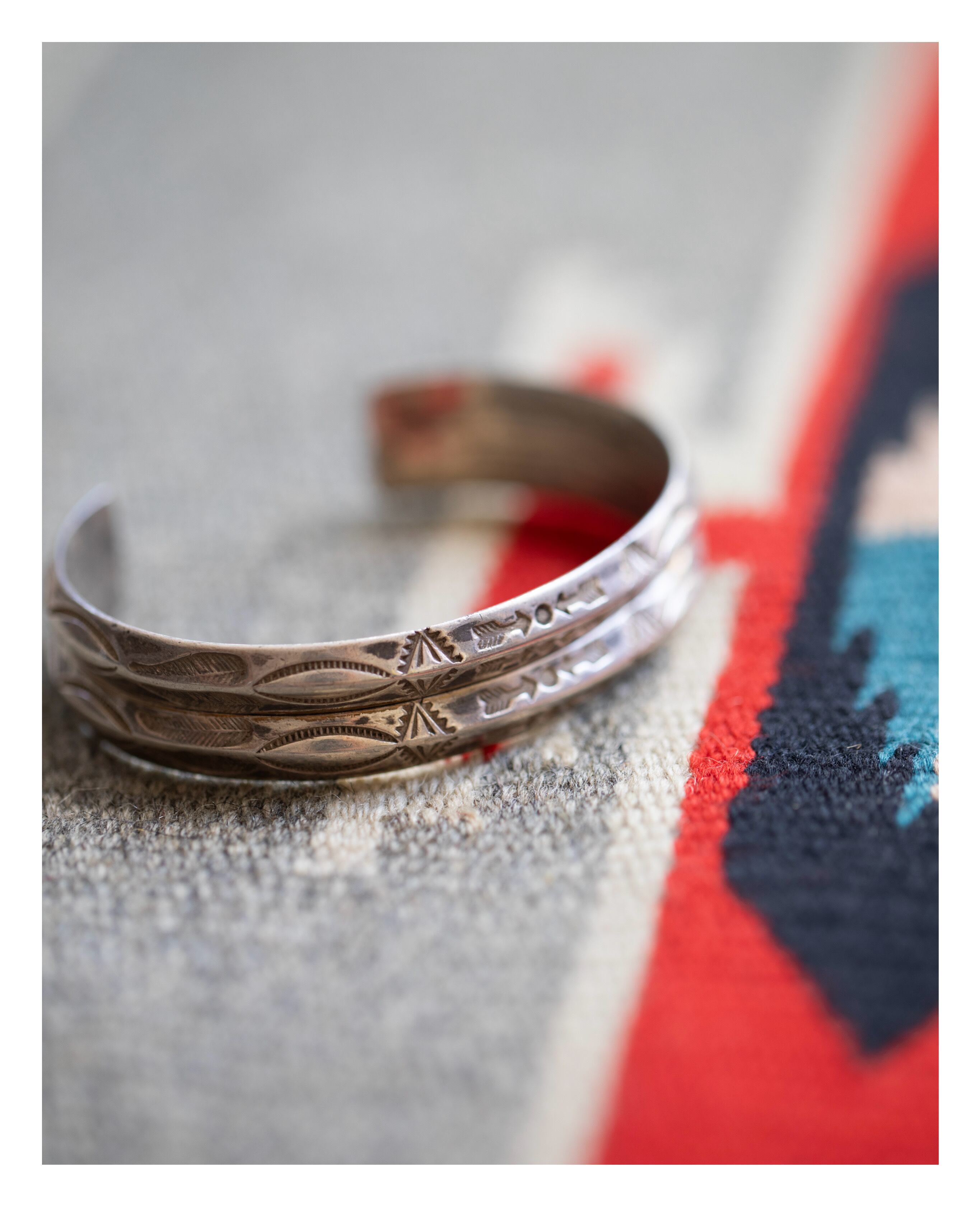 薄く延ばしたシルバーを丁寧に成形し、両端まで均質に刻まれた手打ちのスタンプワークが、当時のクラフツマンシップをそのまま伝えてくれます。