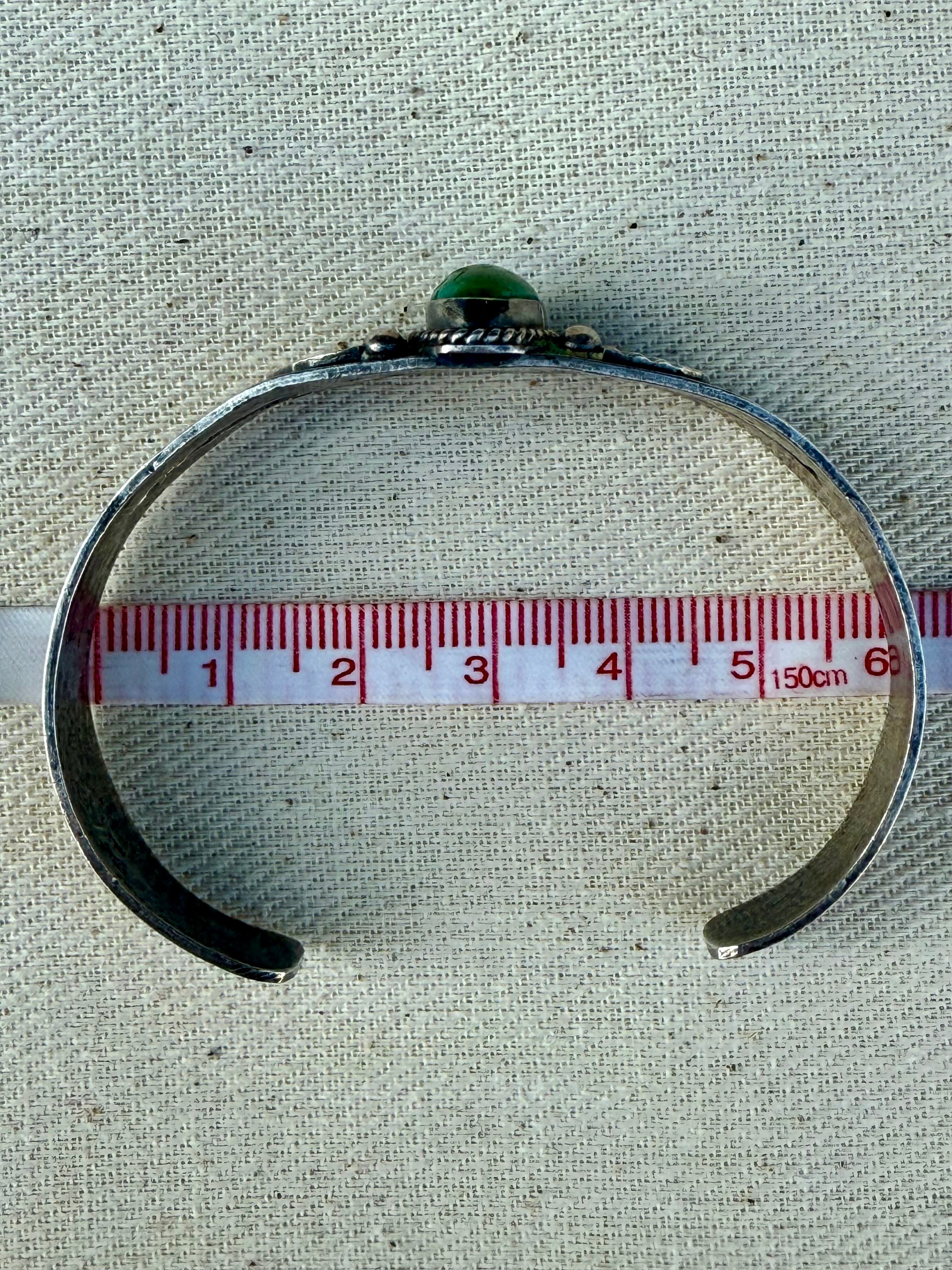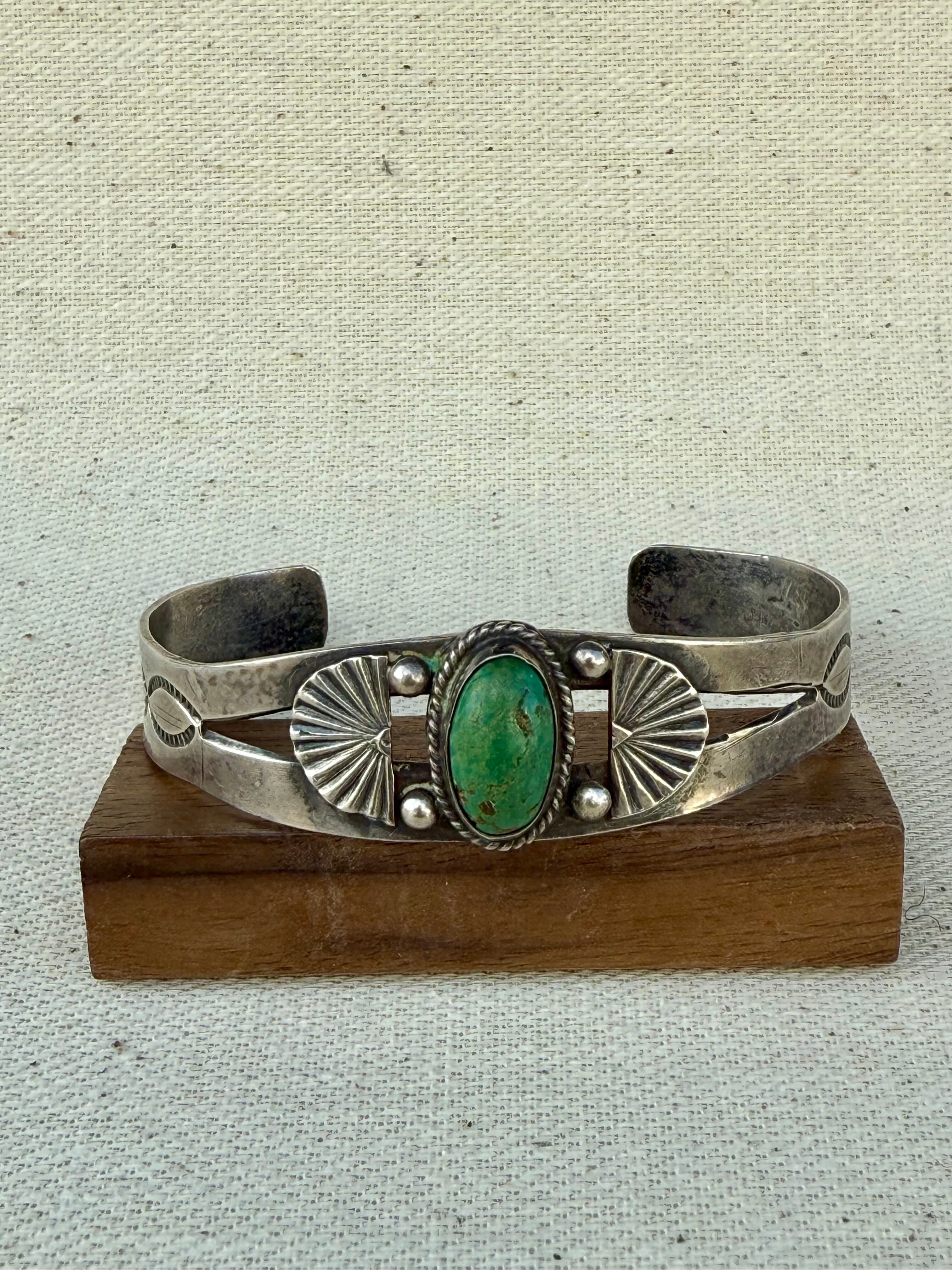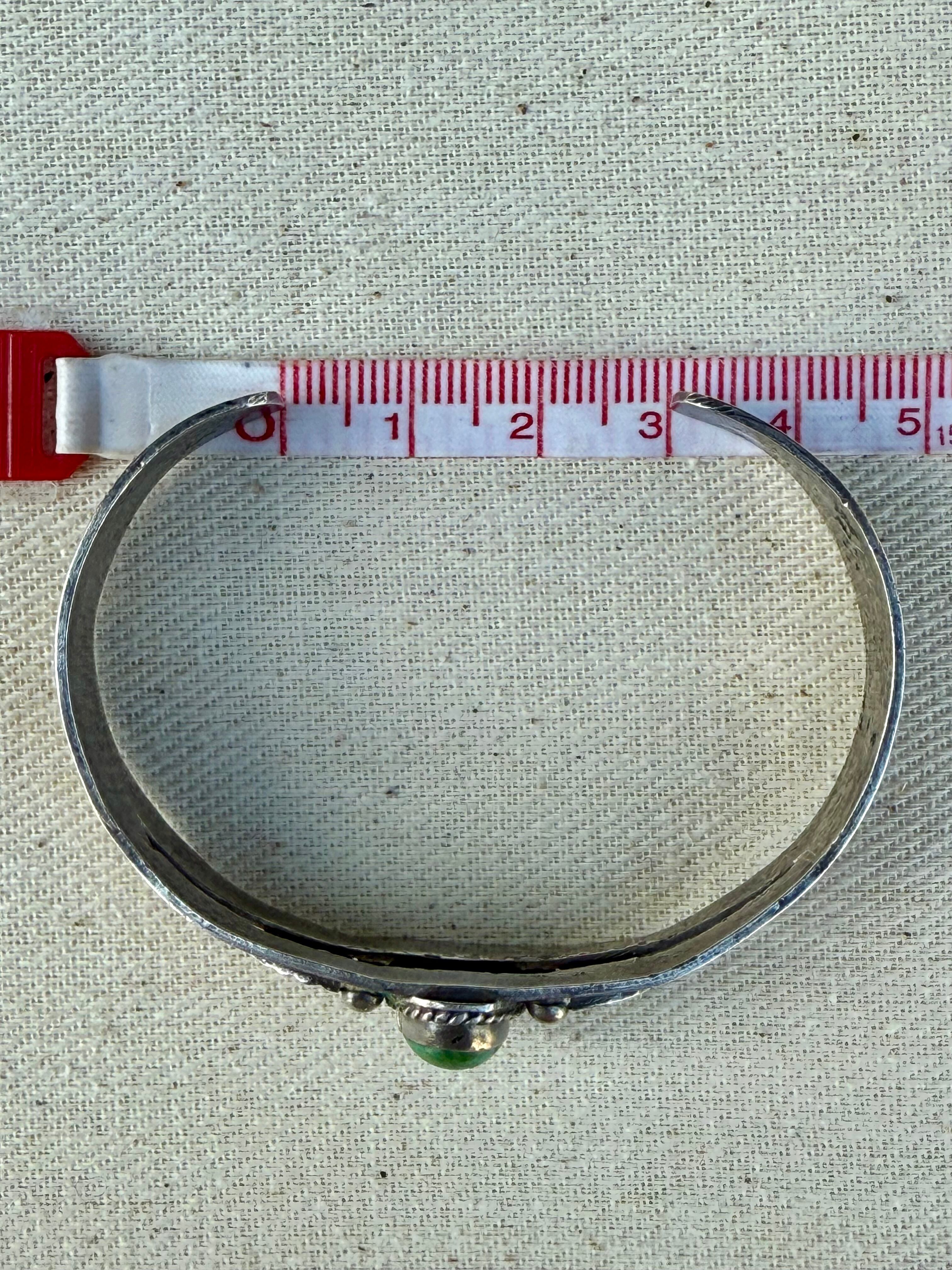 中央にオーバルカットのグリーンターコイズを据えた、初期サウスウエスト・シルバーバングル。