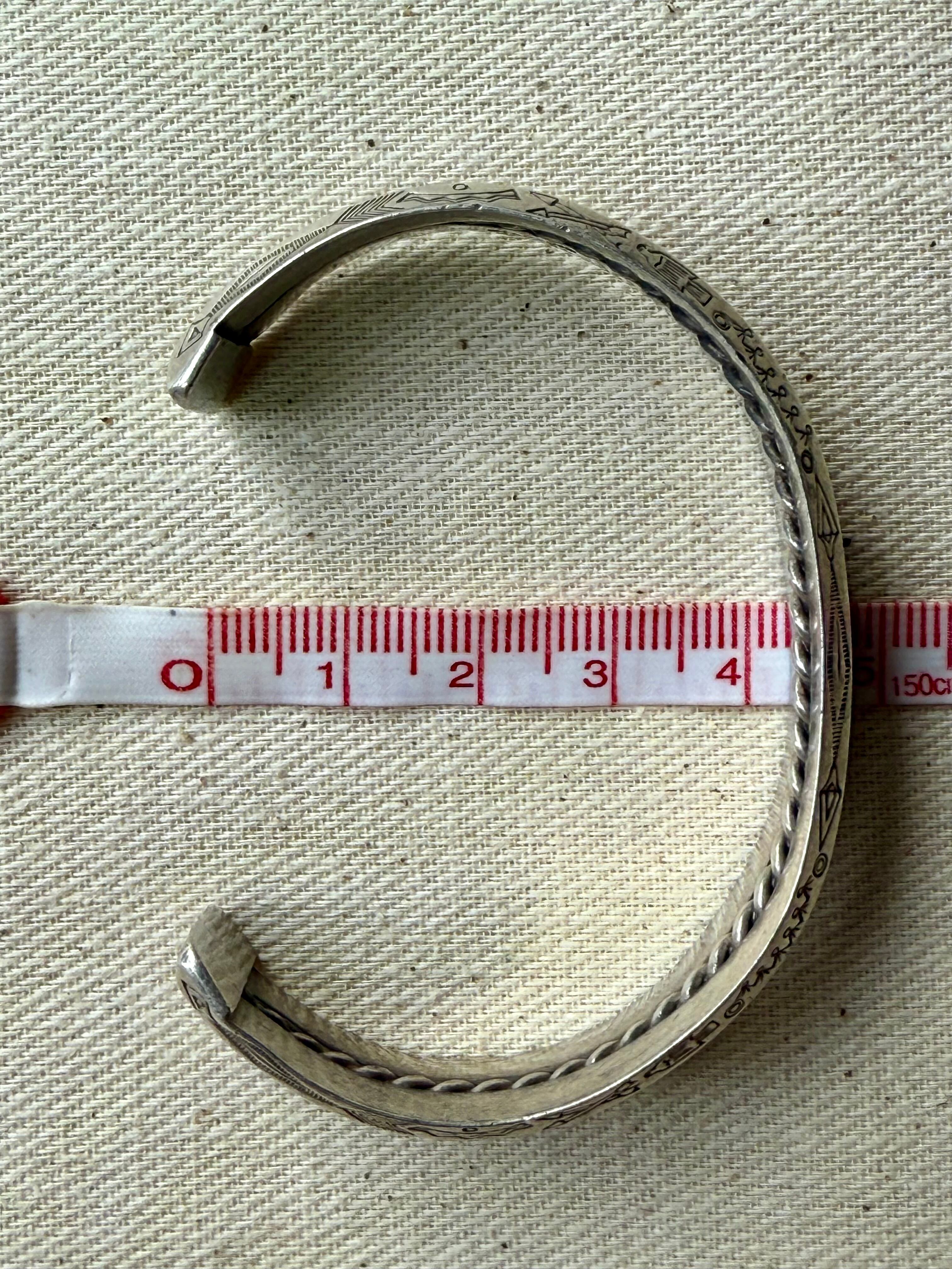 約13.5cm + 3.5cmオープニング x 幅1.5cm (手首にはめる際、多少の調整は可能です。)