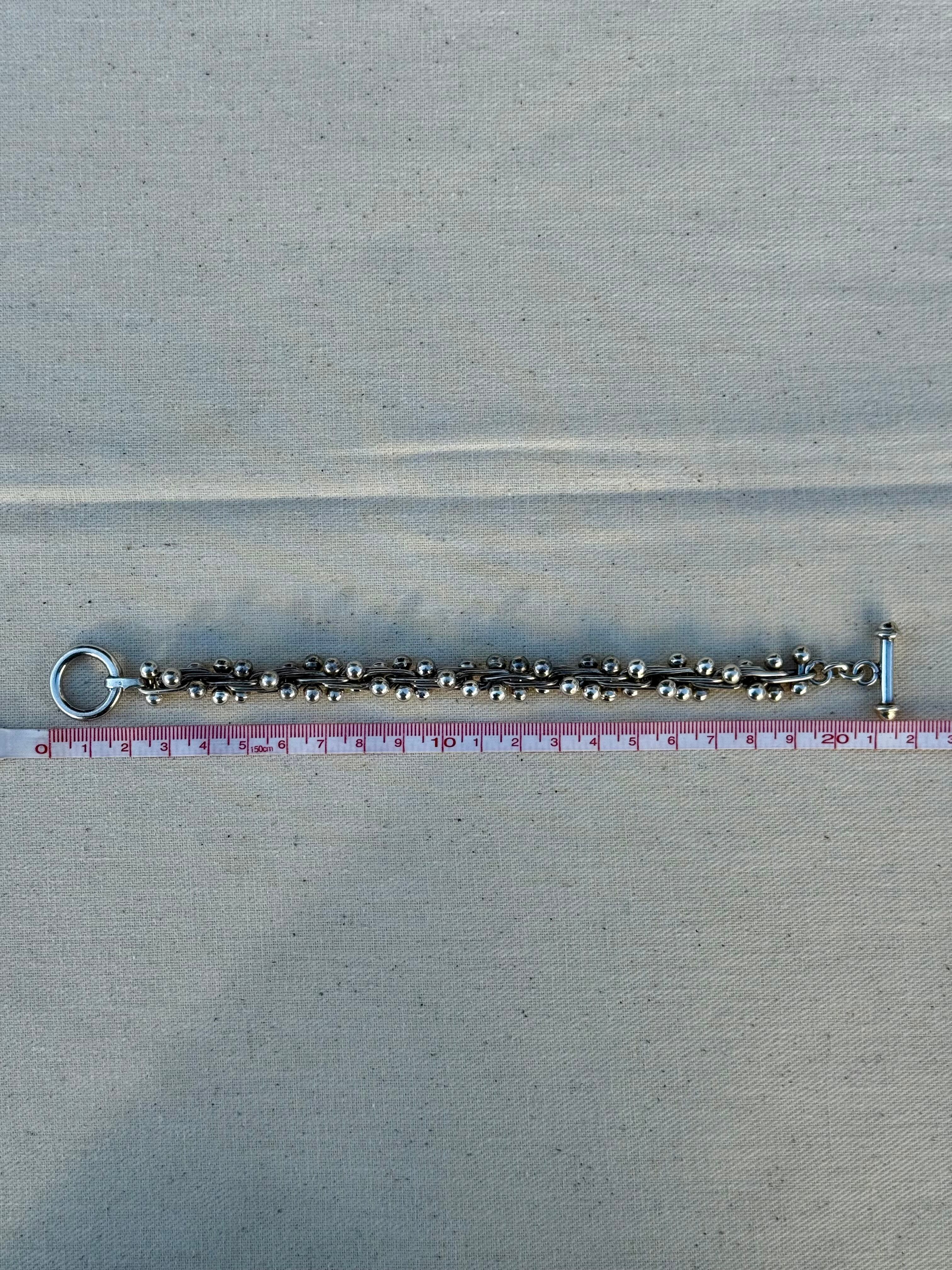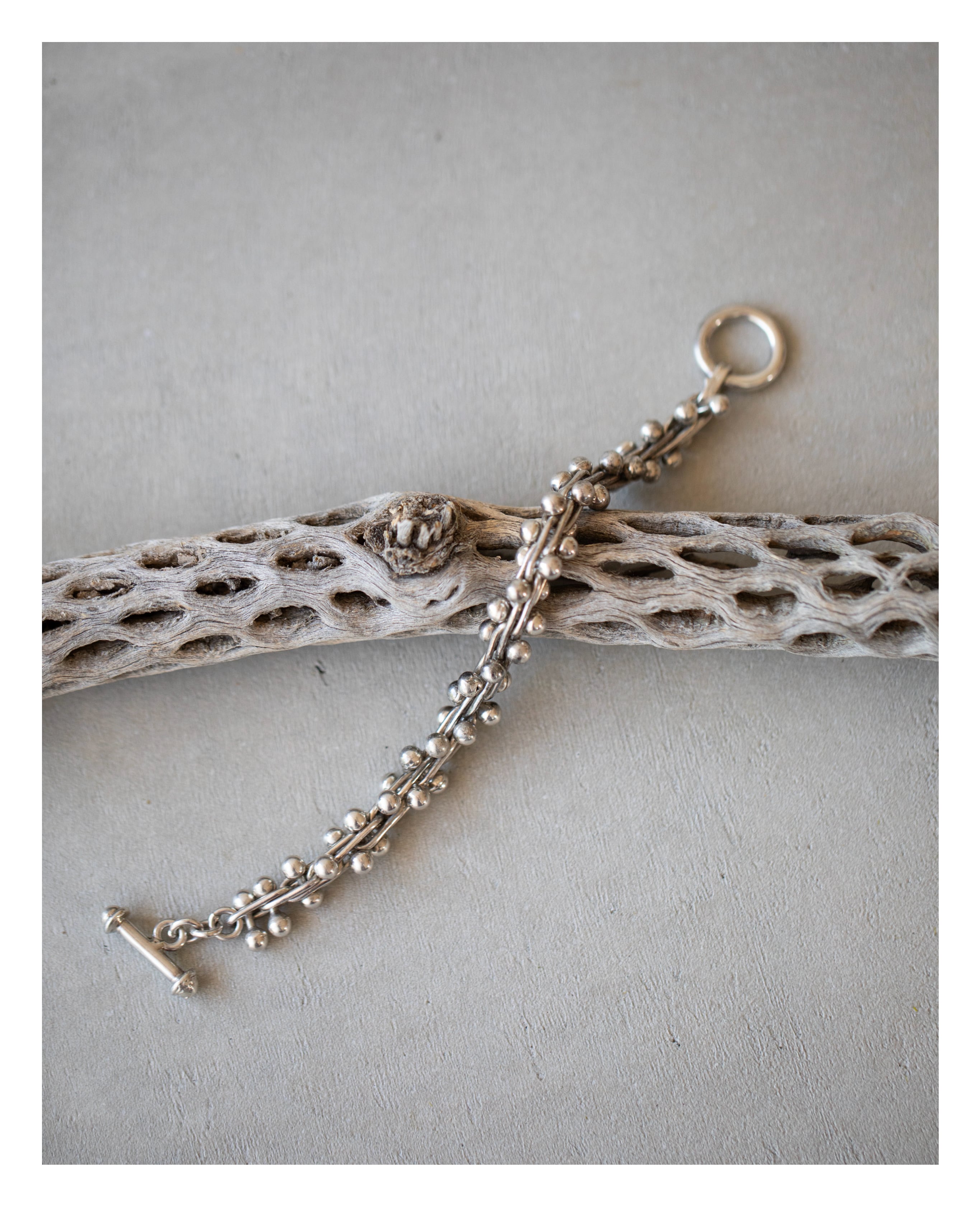 二本のシルバーワイヤーが緩やかに交差しながら連なり、その間に球状のシルバービーズが規則的に配された構成。