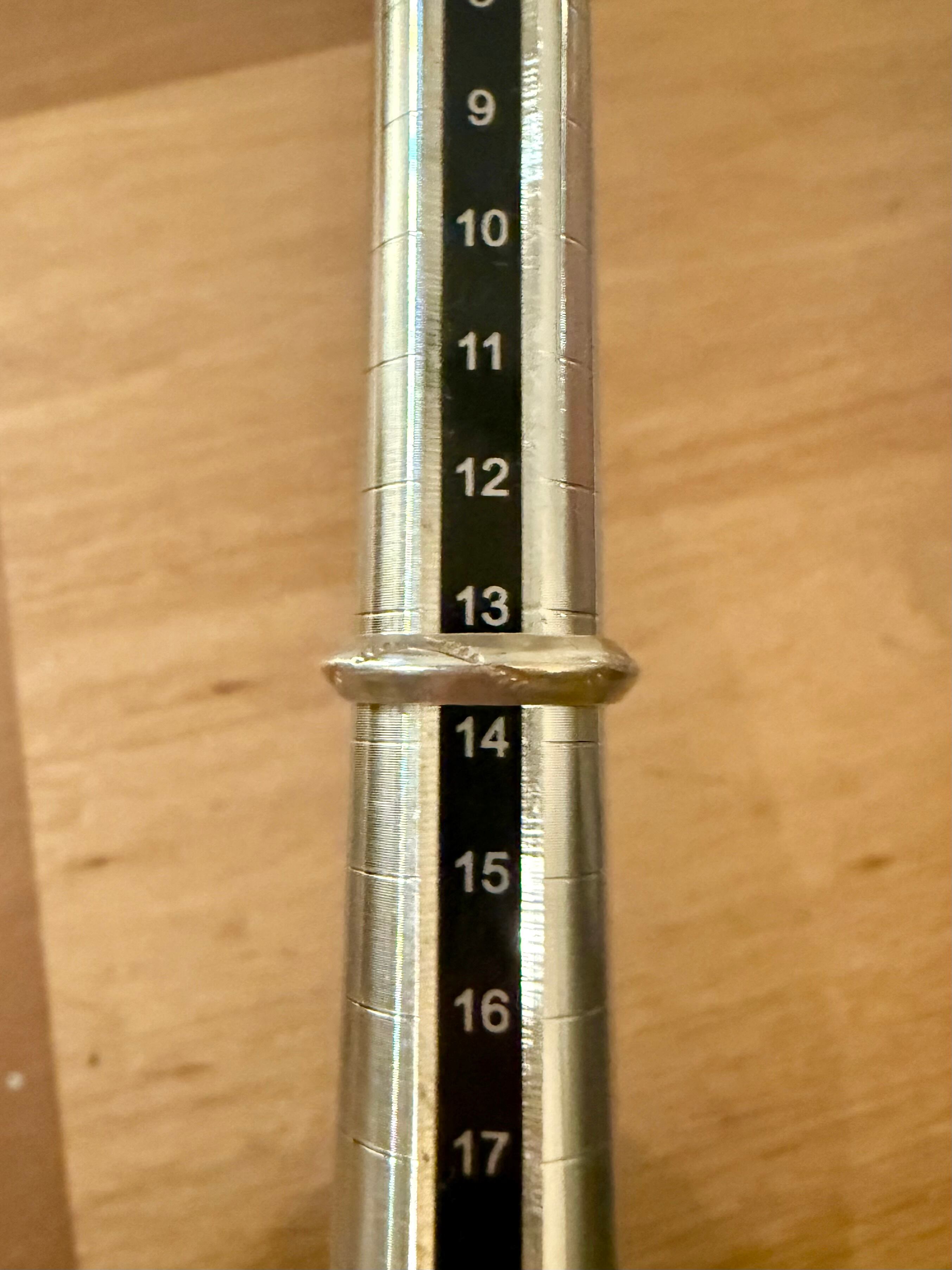板状のシルバーを曲げて円環を成形し、継ぎ目をロウ付けで留めた、初期〜ミッドセンチュリー期のナバホジュエリーに見られる簡潔な構造を持つ一本です。