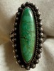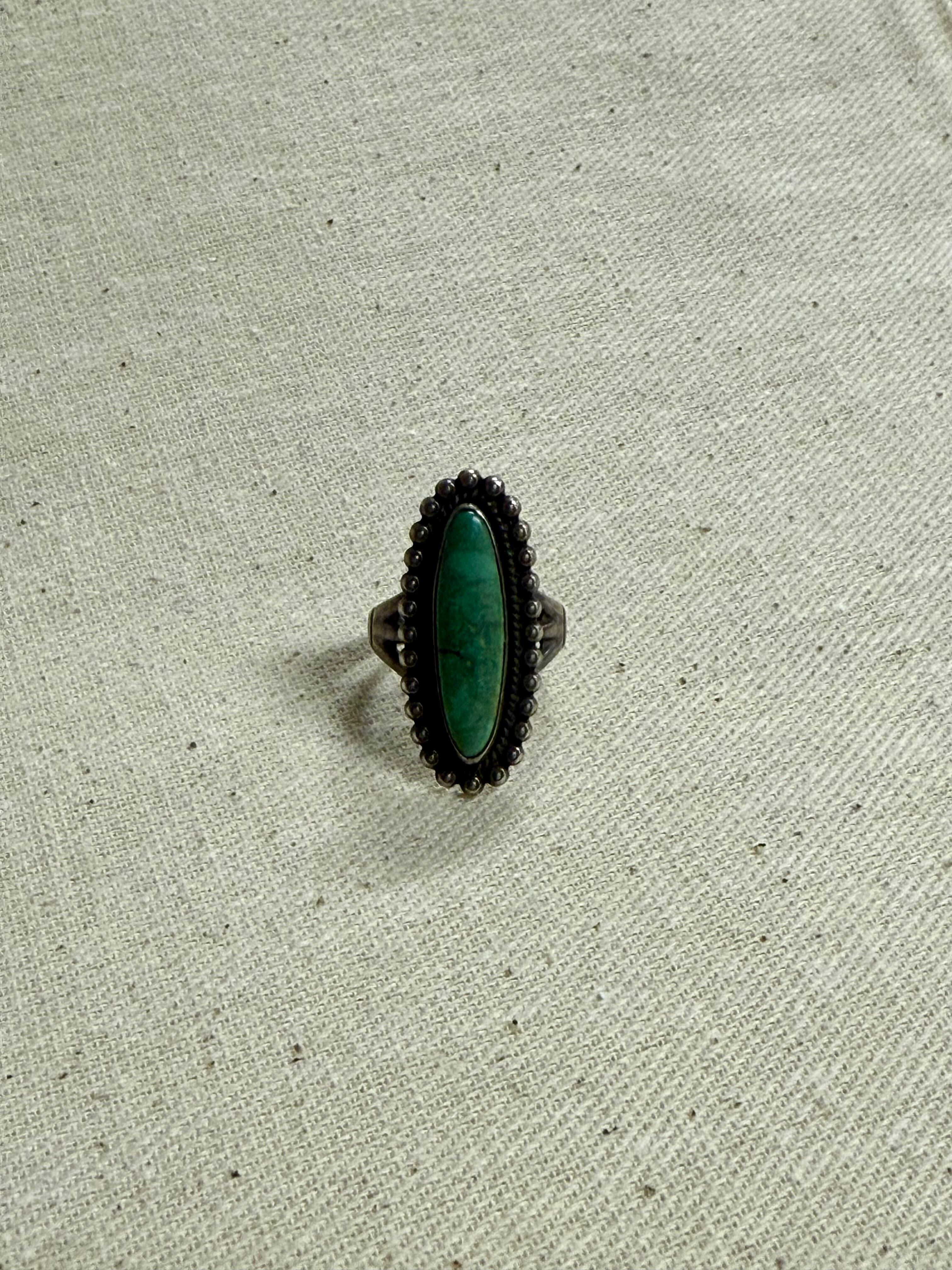 細長いシェイプのターコイズを主石に据えた、ヴィンテージ・シルバーリング。