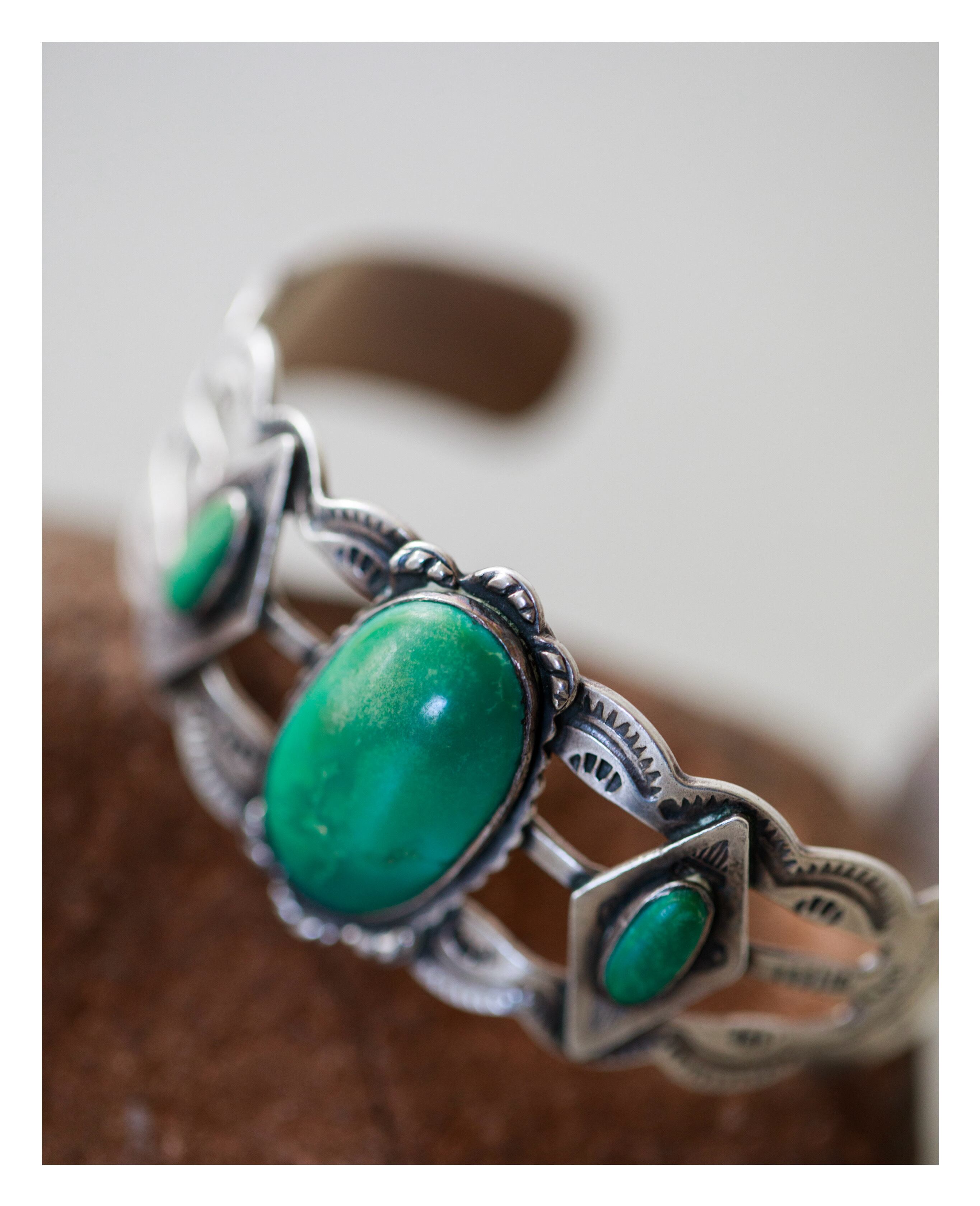 ターコイズの質量感と落ち着いたグリーンの色味、そしてワイドなスプリットバンド。