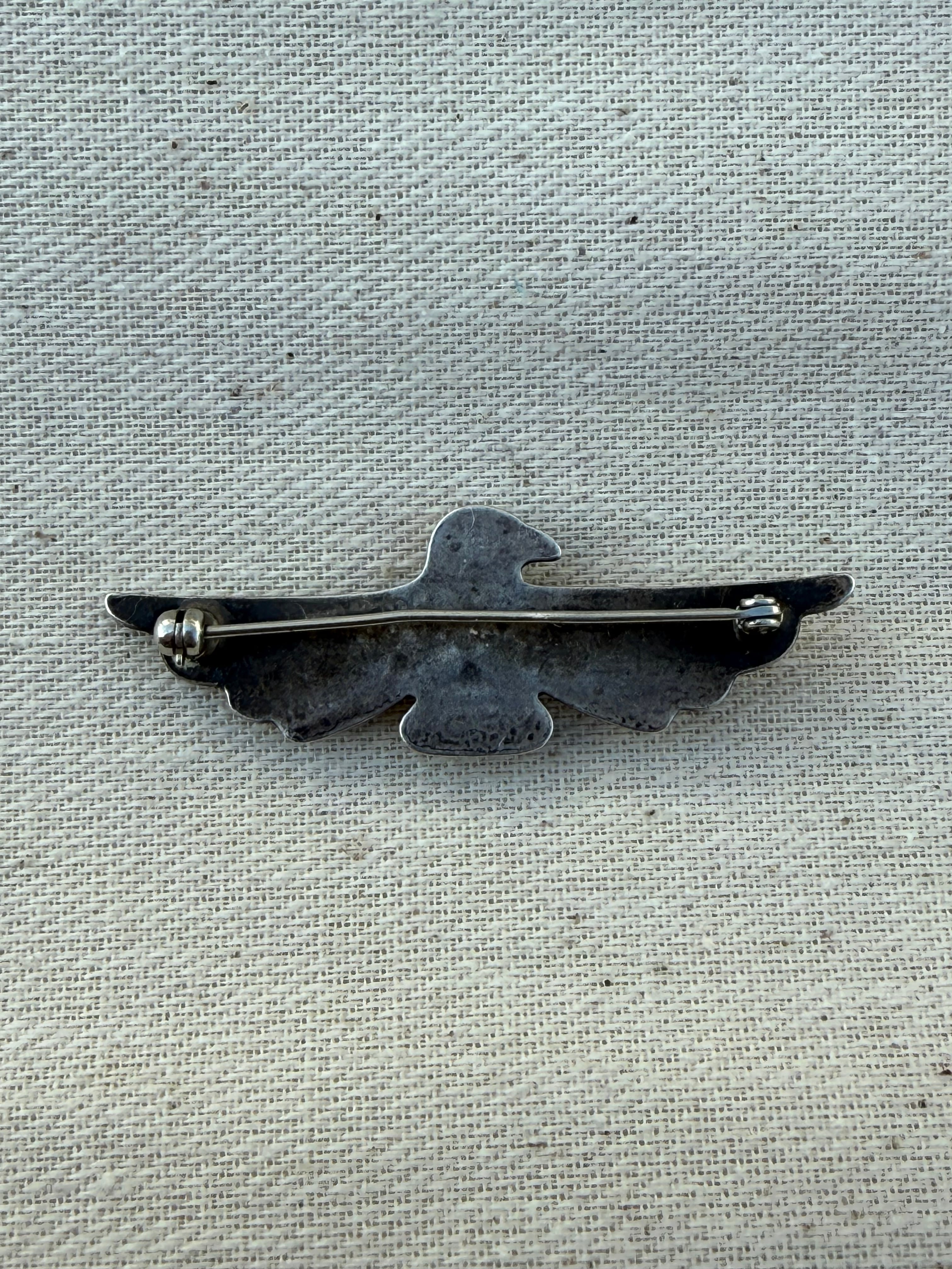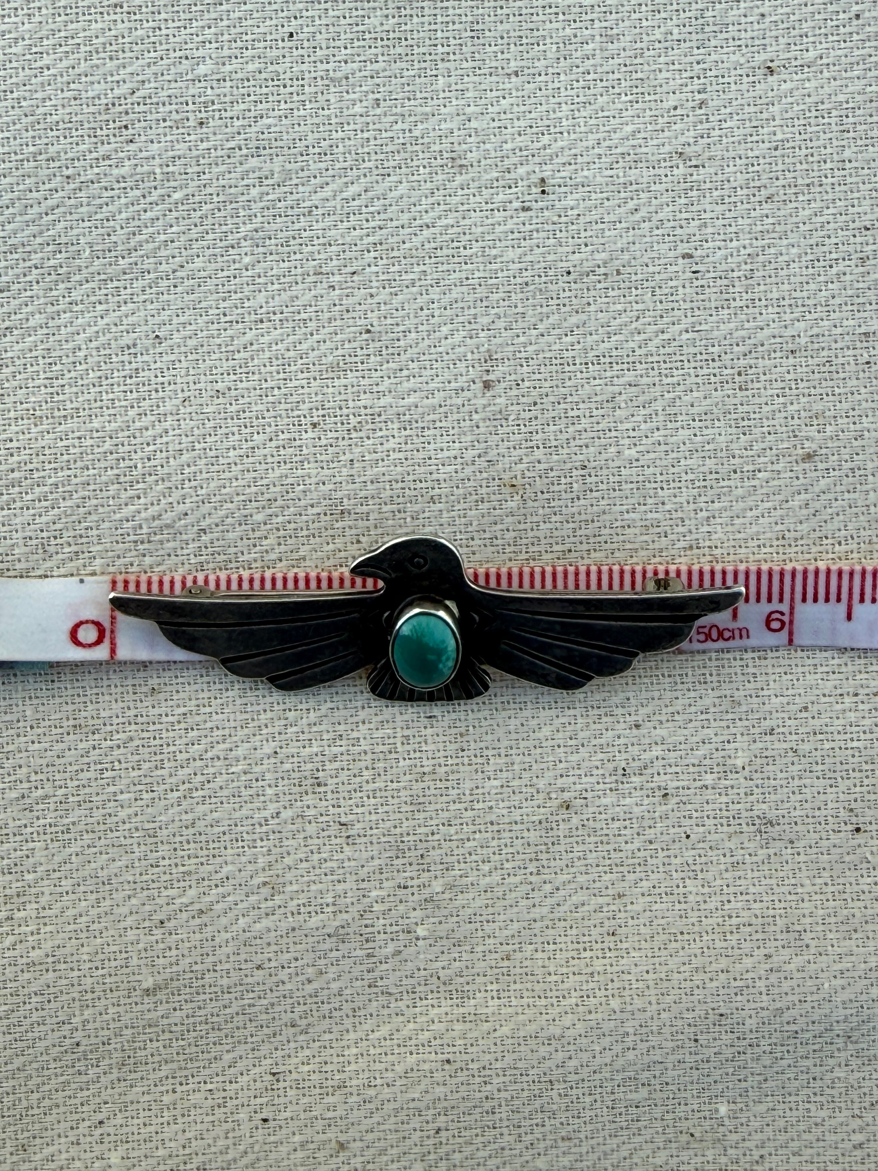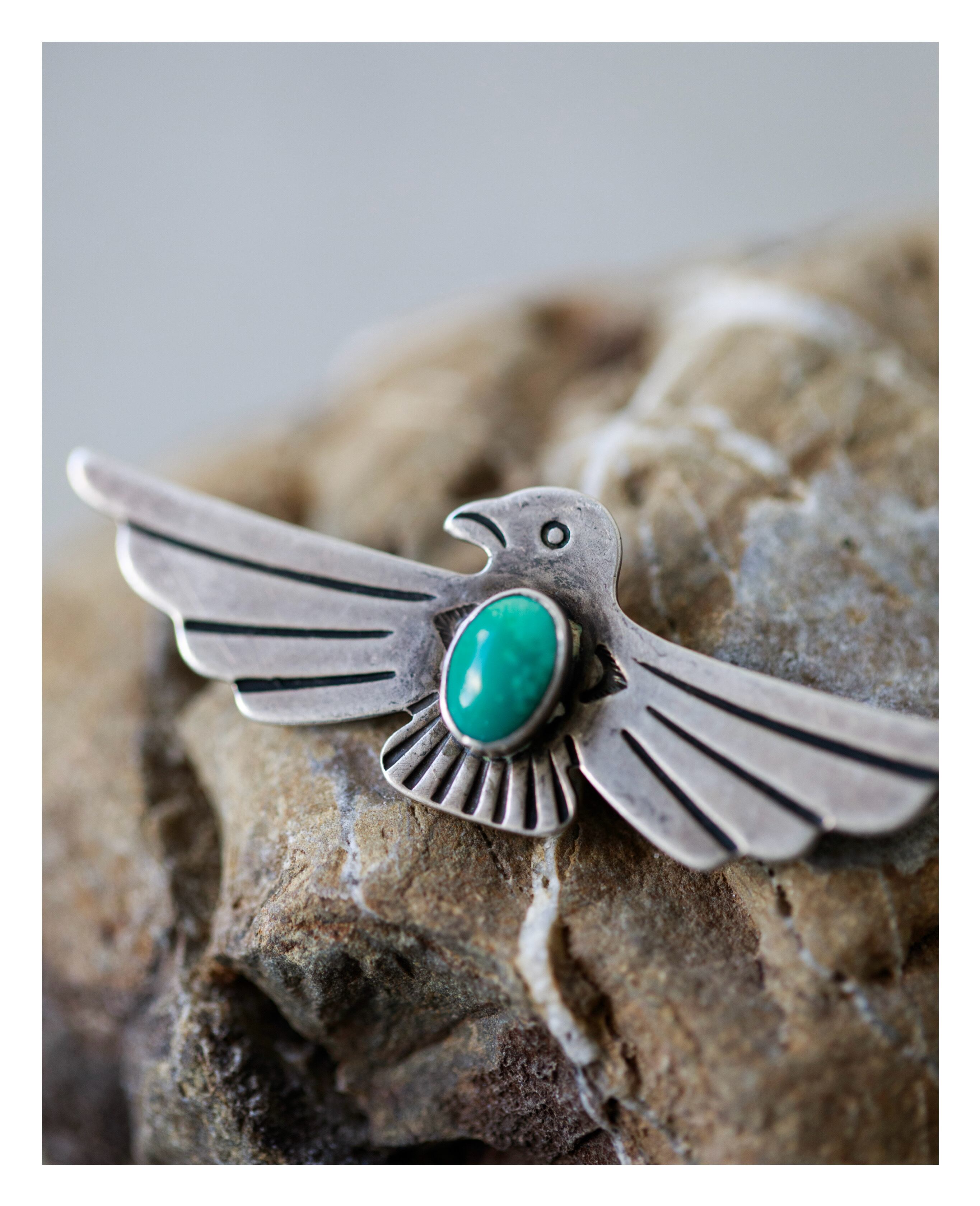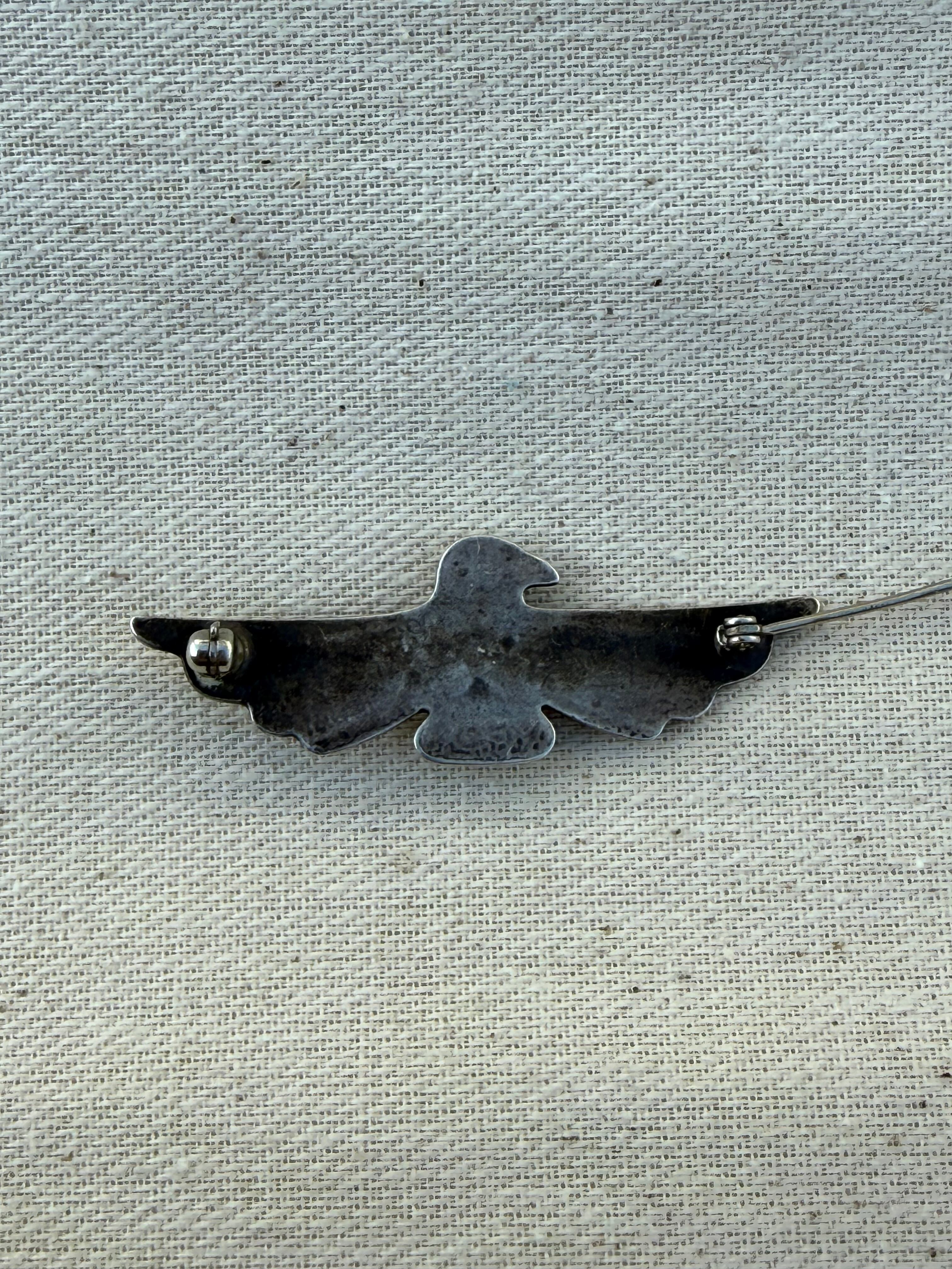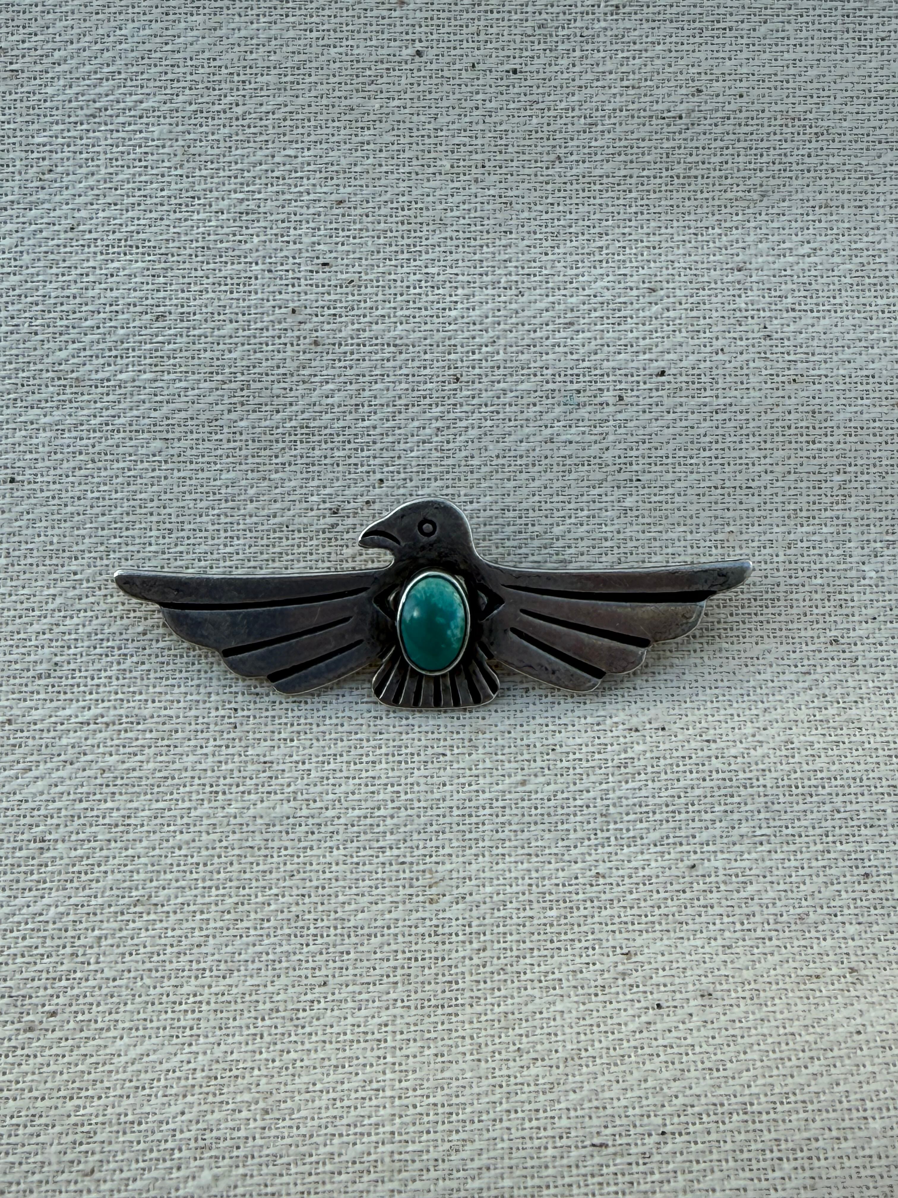 Hand-Stamped Thunderbird Brooch with Turquoise (c. late 1930s–early 1940s)