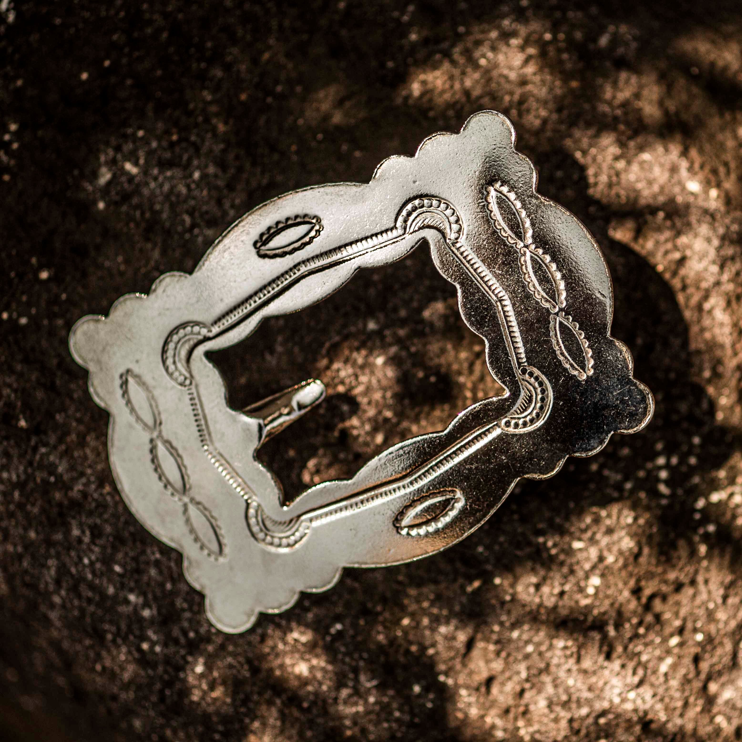 Details - Measurements: 5.5cm x 7.8cm - Material: Nickel silver - Fits: 細身のベルトから40mmくらいの太さのベルトまで取り付け可能です。 - Dead stock condition